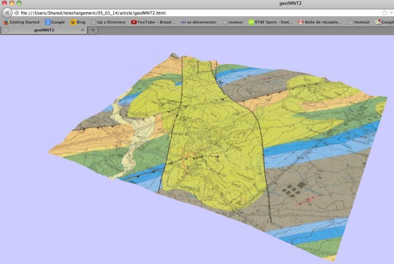 - le deuxième exemple montre le même MNT, mais avec une couche raster (carte géologique):