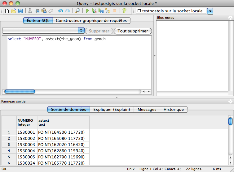 select place, AsText(geom)from matable place | astext ---------+---------------------- Place 1 | POINT(-120 50) Place 2 | POINT(70 40) Place 3 | POINT(-23.5 10.5678) (3 lignes)