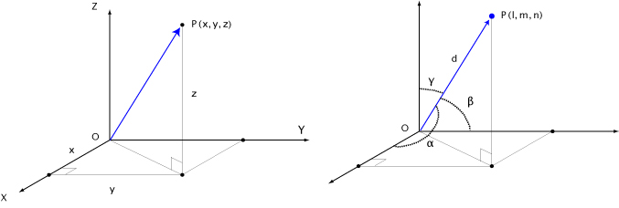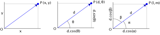 - par des coordonnées polaires (d,θ) ou des coordonnées sphériques (d,φ, θ) (vecteur de direction);