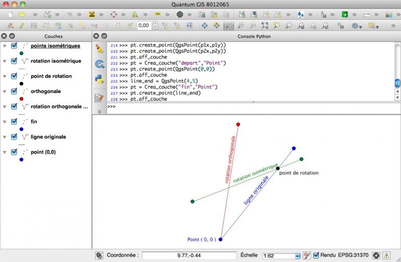 Nous voici armés pour la deuxième partie, l'application tous ces éléments dans PyQGIS: des géométries, des vecteurs, de l'algèbre vectorielle ou des cosinus directeurs, exemples d'applications. Toutes les fonctions ont été regroupées dans le script algèbre_vect_PyQGIS.py.