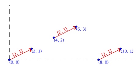 De ce fait, un vecteur peut être déplacé n'importe où dans l'espace, à condition que ses trois composantes, direction, sens et longueur ne changent pas. Ainsi tous les vecteurs de la figure suivante sont égaux, même si les positions des points sont différentes, à la différence des vecteurs géomatiques qui ne sont que des cas particuliers nommés vecteurs de position ou vecteurs de coordonnées (il y a bien d'autres domaines ou la notion de vecteur n'a aucune composante de position comme les vecteurs en physique et autres disciplines, vecteurs de forces, de contraintes, de déformation, etc., voir une très belle illustration de ces concepts en géologie dans les articles de Pierre Thomas sur Planet-Terre, Une bélemnite cisaillée : déformation et contraintes ou En avril, les poissons se font failler):