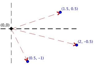 - soit comme des vecteurs normaux avec une origine (point(0,0)) et une extrémité (coordonnées x,y du point).