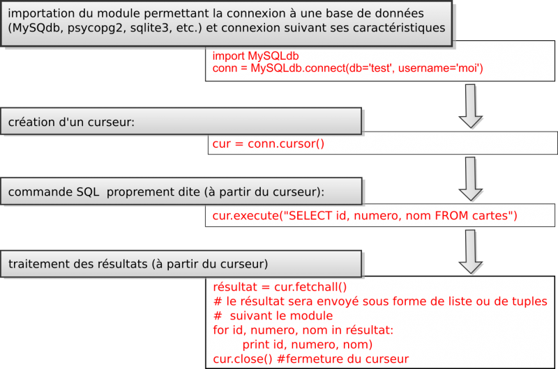 Les résultats fournis par le curseur sont ici sous la forme d'une liste Python. Pour accéder aux divers éléments, il faudra donc utiliser des indices (pointeurs du curseur):