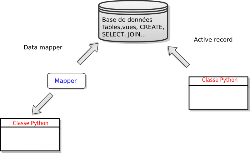 Ceci veut dire, plus simplement ici, que toutes les tables SQL seront transformées en classes Python et que tous les traitements (query, jointures, héritages, etc.) ne concerneront plus que des relations entre objets Python. Les deux techniques possibles sont expliquées dans la figure suivante (liaisons tables SQL - classes Python créés par un "mapper" ou directes).