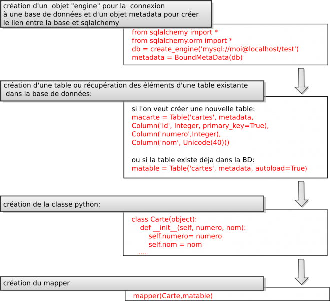 Le mapper ou lien est fait entre la table "cartes" par l'entremise de "macarte" (création) ou "matable" (récupération) et la classe Carte. A partir de ce moment, tous les traitements (créations de tables, requêtes, mises à jour, suppressions, jointures, etc.) se feront en Python à partir de la classe Carte