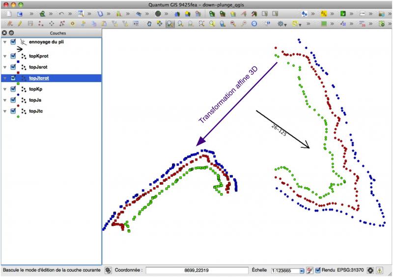Je peux donc transformer le « down-plunge profile » présenté dans Python: utilisation des couches vectorielles et matricielles dans une perspective géologique, sans logiciel SIG en fichier shapefile: