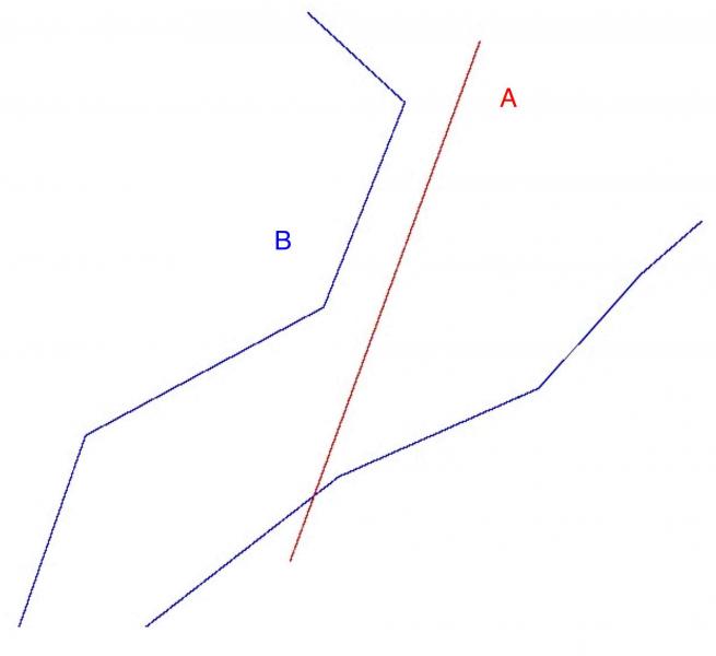 Trouver les azimuts ou directions d'objets géologiques linéaires est une tâche courante en géologie pour les traitements postérieurs. Or si calculer la direction d'une ligne simple (A) est facile, ce n'est pas le cas du calcul des azimuts des segments de lignes plus complexes (B):