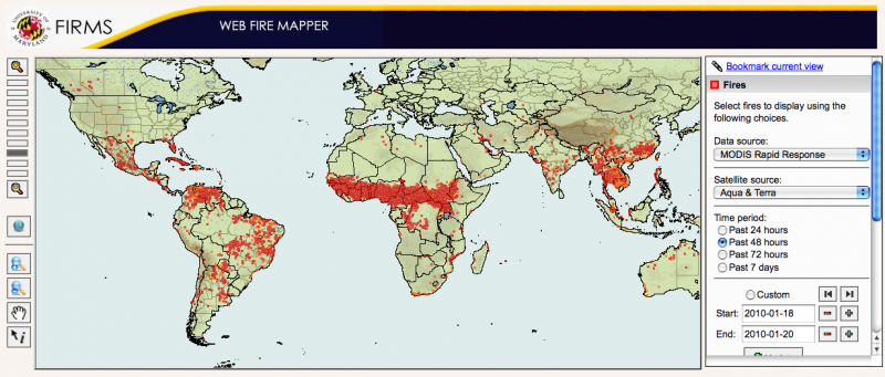 Bien plus, il montre les grandes possibilités de Basemap en superposant des shapefiles à ces images . En effet, d'autres données issues de Modis, vectorielles, peuvent aussi être utilisées. Le site maps.geog.umd.edu/firms/ recense la distribution mondiale des incendies (Observatoire d'Alerte incendie - Fire Information for Resource Management System -FIRMS ), avec le même ordre de mise à jour que les images satellites.