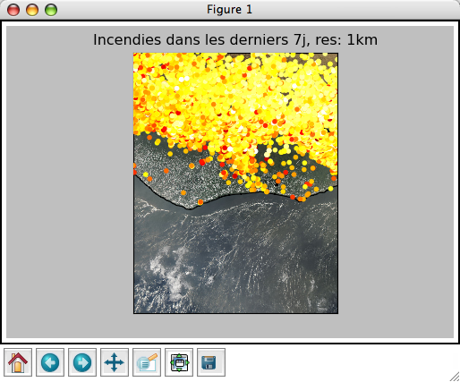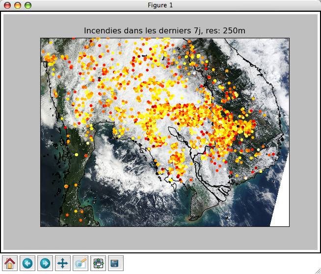 Son script permet aussi de les traiter. Les données d'incendies sont téléchargées au format shapefile et projetées par Basemap sur la zone Modis correspondante. Comme il n'y a pas beaucoup d'incendies référencées en Europe, j'ai choisi une zone en Afrique et une autre en Indochine avec des satellites et des résolutions différentes.
