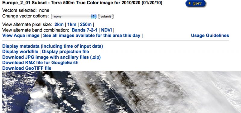 Si l'on clique sur l'une de ces zones, les différentes cartes du jour, selon le satellite, le type de données et leurs résolutions (2km, 1km, 500m, 250m), sont proposées. En choisissant l'une des résolutions, l'écran suivant (partiel pour la photo) est obtenu :