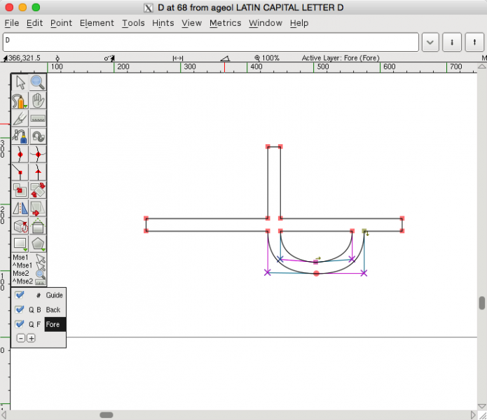 En double-cliquant sur le caractère (en remplacement d'un caractère existant, D dans le cas présent), on obtient une interface de dessin vectoriel classique qui permet de (re)dessiner le caractère ou d'importer directement une figure Inkscape (SVG) ou d'autres formats (images, PDF, EPS, ...):