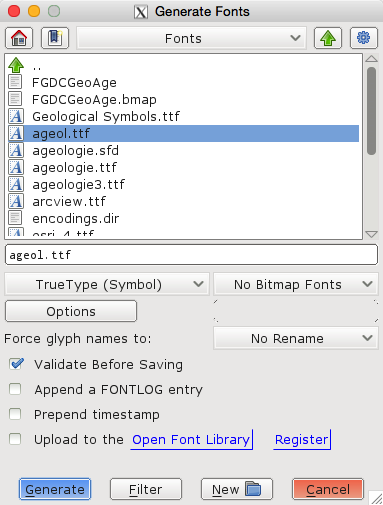 Puis on génère la police pour pouvoir l'utiliser dans QGIS ( format True Type ici)
