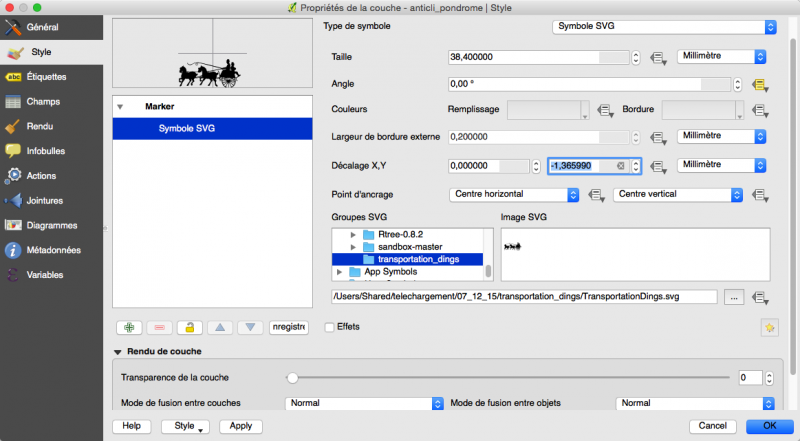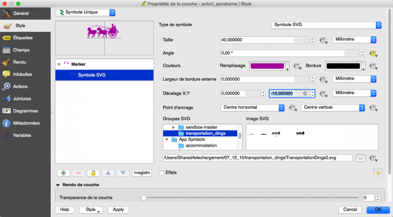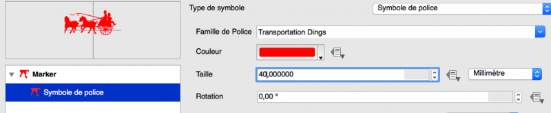 Il est possible de les faire tourner de manière absolue (Rotation) ou en fonction de la valeur d'un champ, de modifier leurs couleurs (sans les problèmes rencontrés dans l'article de Nicolas Rochard comme le remplissage d'un symbole SVG) et de les utiliser pour créer des symboles composites (même en conjonction avec des symboles SVG). Il n'est pas possible d'utiliser des dégradés.