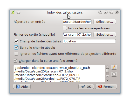 Juste un petit détail, je n'ai pas réussi à utiliser l'index de tuiles. J'ai une erreur: "Unable to find field `location' in DBF file `C:/DATA QGIS/Catalogues/Cat_Ortho_80.shp'". Je ne comprends pas comment QGIS ne peut pas trouver un champs dans un fichier dbf qu'il est justement supposé créer. Je sèche.