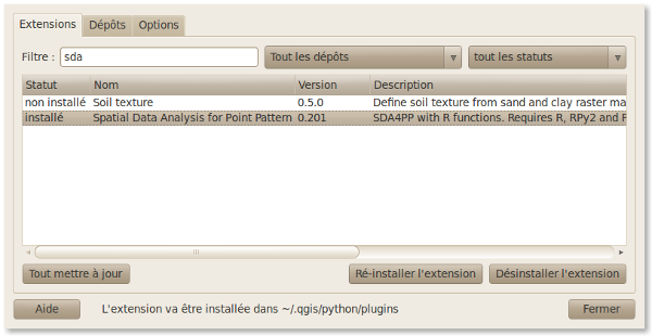 Sur le forumSIG de nombreux utilisateurs semblent avoir des difficultés pour installer le plugin SDA4PP. Ce plugin permet de lancer des commandes R à partir d'une interface graphique intégrée à QGIS.