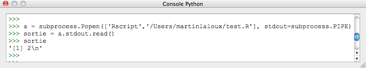 import subprocess def result(): a = subprocess.Popen(['Rscript','/Users/martinlaloux/test.R'], stdout=subprocess.PIPE) sortie = a.stdout.read() return sortie if __name__ == '__main__': result()