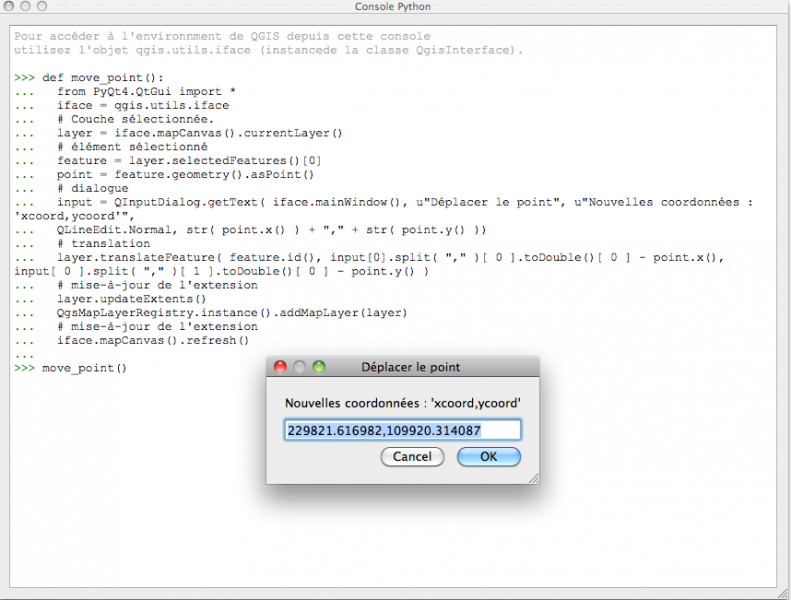 Jusqu'à présent, nous n'avons utilisé que du Python « standard » sans nécessairement faire appel aux modules de PyQGIS. Gary Sherman a récemment montré comment l'utilisation de l'objet iface (qgis.utils.iface) permet de créer des scripts externes qui peuvent interagir complètement avec QGIS (spatialgalaxy.net/2012/01/27/qgis-running-scripts-in-the-python-console/)