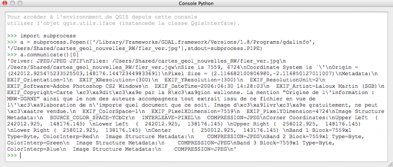 Il est aussi possible de lancer n'importe quel exécutable en lui passant des paramètres et en récupérant les résultats (avec des problèmes avec QGIS sur les systèmes Windows). Illustrons son usage avec une commande inutile (gdalinfo) puisque GDAL est intégré à QGIS :