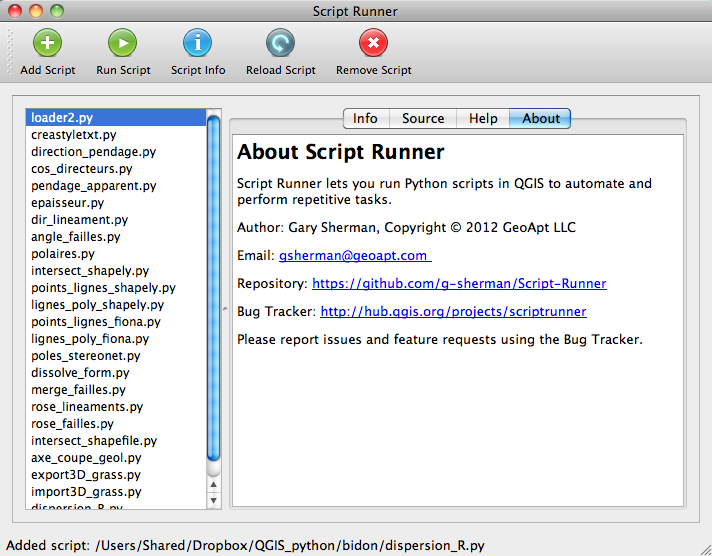 Poursuivant son travail, Gary Sherman a ensuite automatisé le processus en créant une extension qui permet de lancer automatiquement ces scripts, Script Runner (spatialgalaxy.net/2012/01/29/script-runner-a-plugin-to-run-python-scripts-in-qgis/), disponible depuis le menu Extension/Installateur d'extensions python.