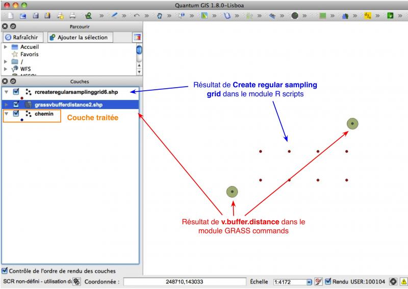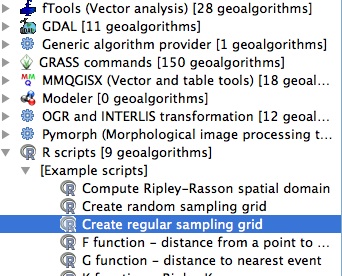 writeOGR(output,"/Users/martinlaloux/sextante/tempdata/rcreateregularsamplinggrid6.shp","rcreateregularsamplinggrid6", driver="ESRI Shapefile")- la couche de départ, chemin.shp est le fichier shapefile original et non la couche QGIS, et la couche résultante sera un fichier shapefile (par défaut ici) placé dans le dossier de traitement, rcreateregularsamplinggrid6.shp;