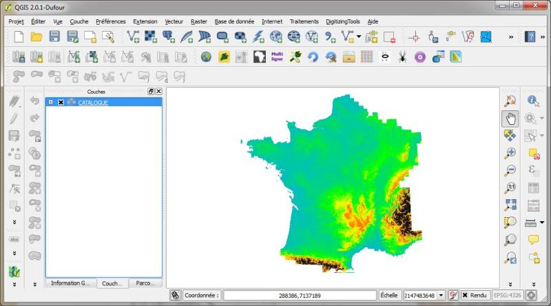 Les pyramides sont des aperçus du raster à différentes échelles. Ils permettent donc à QGIS, une fois générés, d'afficher très rapidement un raster qu'elle que soit l'échelle (ci dessous la BD Alti 75m de l'IGN sur toute la France).