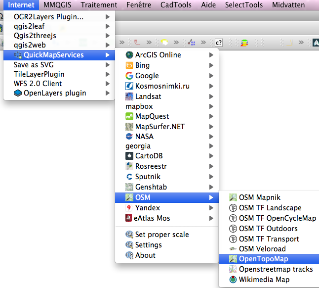 Il existe à l'heure actuelle trois solutions dont je vais expliquer ici les procédures en prenant comme exemple l'affichage des tuiles de OpenTopoMap, projet allemand qui mêle les données OSM et SRTM pour créer des cartes topographiques ombragées avec des courbes de niveau (wiki OpenStreetMap: OpenTopoMap).