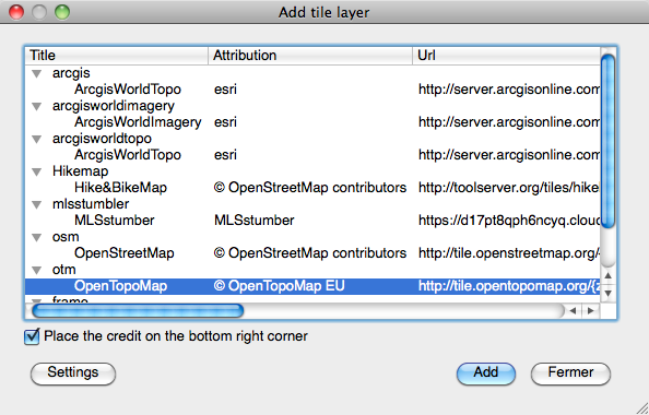Le format de ces fichiers est (titre de la couche, crédit (très important) et URI) :