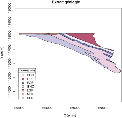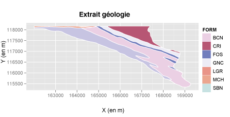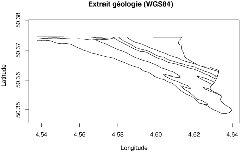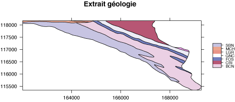 # Fichiers library(maptools) #autre possibilité geol <-readShapePoly("cal.shp") library(rgdal) geol = readOGR(dsn=".", layer="cal") library(PBSmapping) geol = importShapefile("cal.shp") library(shapefiles) geol <- read.shapefile("cal") .... # PostGIS geol = readOGR("PG:dbname=test", "cal") [il existe des paquets permettant de se connecter directement à PostgreSQL ou des paquets permettant de se connecter par ODBC mais ils ne gèrent pas la géométrie] # Grass GIS library(spgrass6) G <- gmeta6() geol = readVECT6("cal", ignore.stderr=TRUE, plugin=NULL) [il existe des paquets pour se connecter à ArcGIS ou Oracle mais je ne dispose pas de ces logiciels]