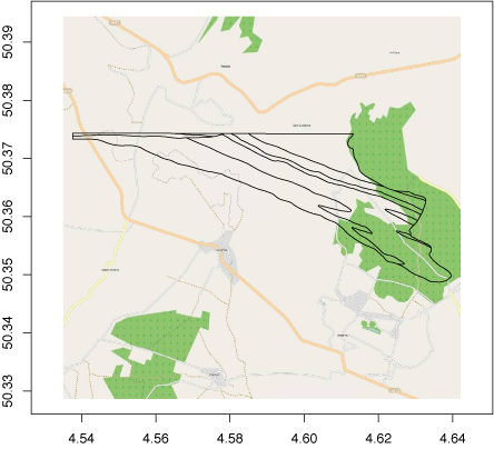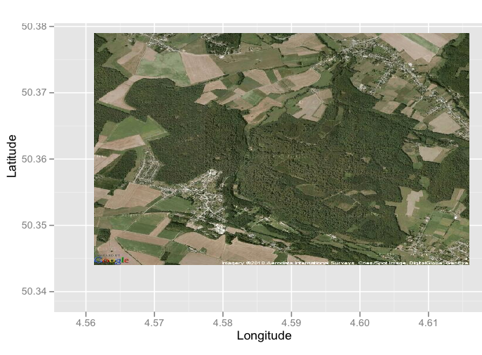 - le paquet RgoogleMaps permet alors d'utiliser les fonds Google Maps comme carte. Il faut une clé Google, gratuite, pour pouvoir l'utiliser (fonds seul, avec le paquet ggplot2, objet spatial sur le fonds, sans paquet)