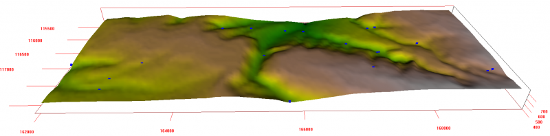- avec les points d'échantillonnage géochimique superposés en bleu (en 3d):