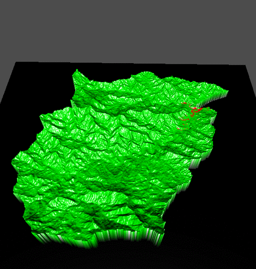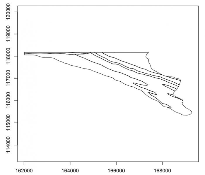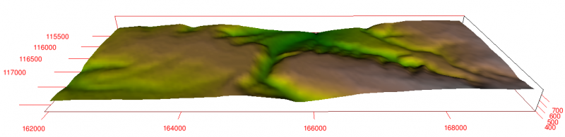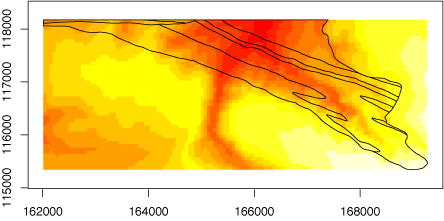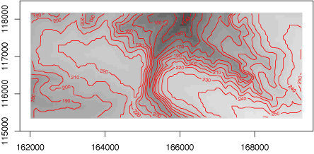 - R sait créer des cartes 2d et 3d très sophistiquées qui peuvent être exportées dans divers formats, bitmap (tiff, JPEG, png ...), vectoriel (EPS, PDF, svg...) ou latex. Ceci d'une manière beaucoup plus pointue que ne le permettent des SIG comme GRASS;