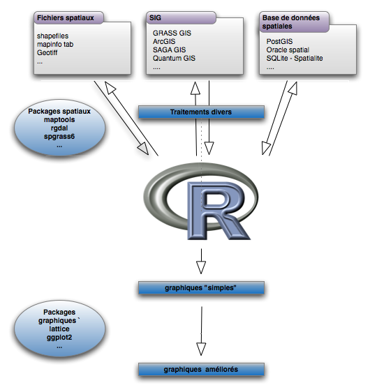 - Pour obtenir les données SIG à traiter, R va utiliser des packages spatiaux. (cran.r-project.org/web/views/Spatial.html). Ceux-ci vont permettre la lecture de fichiers comme les shapefiles, la connexion avec de nombreux SIG, ou la connexion avec des bases de données spatiales, ou non;