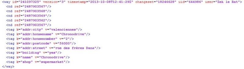 Exemple d'élément enregistré dans le fichier osm au format XML