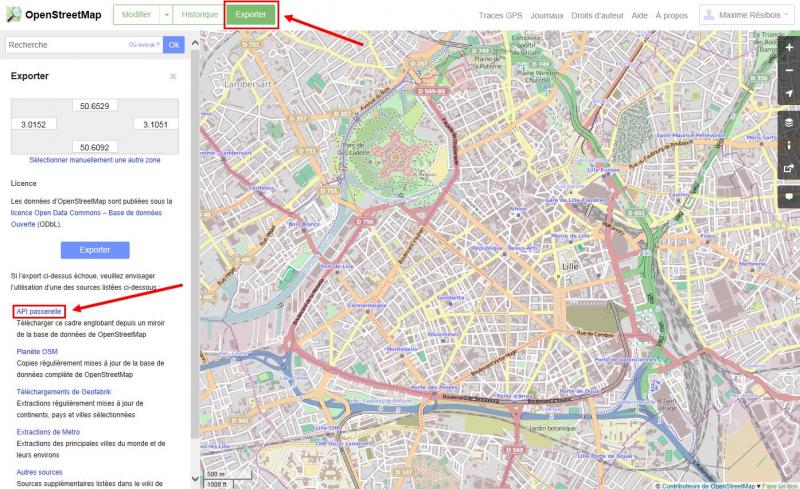 Dans un premier temps, téléchargez le fichier .osm de la zone voulue en vous rendant sur le site d'OpenStreetMap, zoomez sur la zone qui vous intéresse, cliquez sur le bouton Exporter et choisissez l'export via l'API passerelle : votre navigateur téléchargera alors le fichier .osm. Attention : il est possible que le fichier téléchargé n'ait pas d'extension, si c'est le cas, renommez-le pour lui adosser l'extension .osm