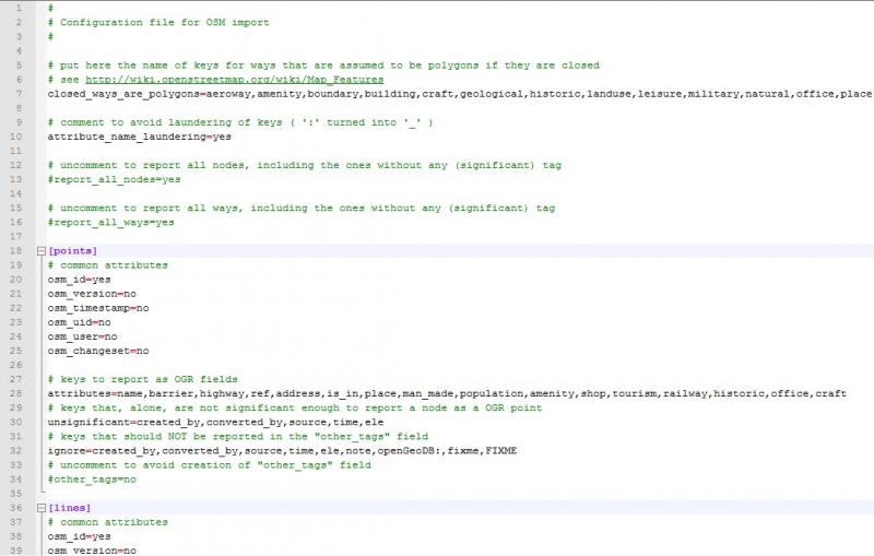 Le fichier osmconf.ini qu'il faut éditer afin de régler les paramètres d'extraction de GDAL/OGR pour les fichiers .osm