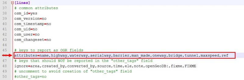 Note 2 : N'oubliez pas d'ajouter les clés que vous allez utiliser pour les requêtes suivantes dans les lignes "attributes=" concernées du fichier osmconf.ini