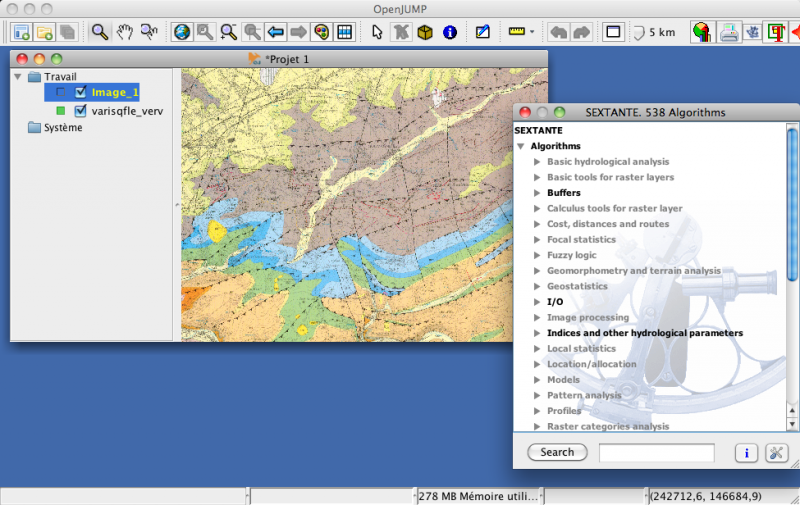 Plus limité dans le traitement des rasters, il peut néanmoins bénéficier, avec la version 1.5.1, de l'extension Sextante (www.sextantegis.com/), déjà disponible sur GvSIG.