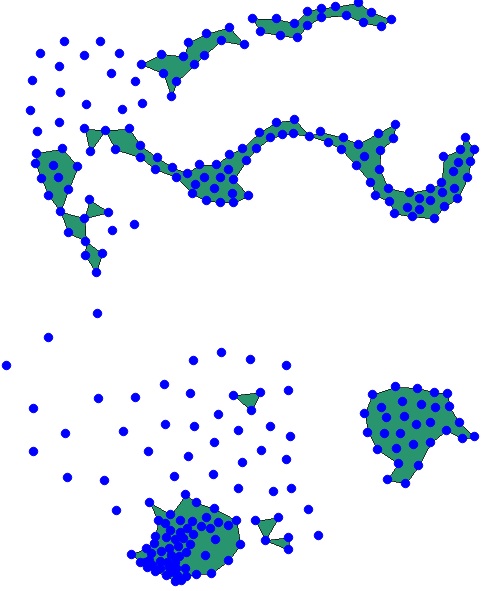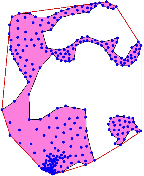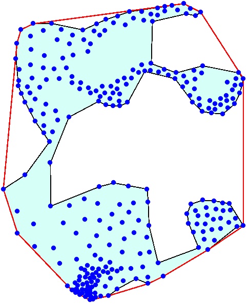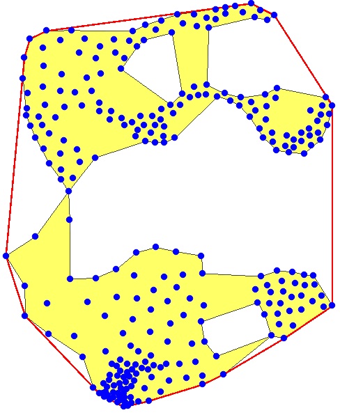 - exploitant les généralisations de ces formes alpha comme Concave hull (pdf), qui permet les partitionnements (clusters, utililisé avec un plugin de QGIS, voir plus bas), Alpha-Concave Hull (pdf), alpha convex hull, etc.;