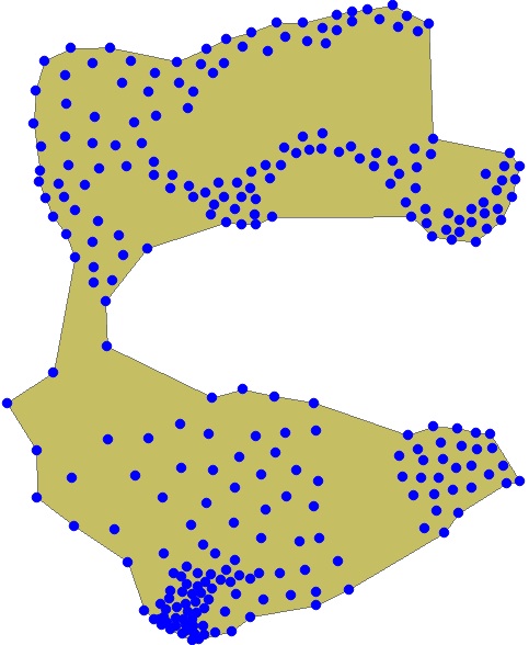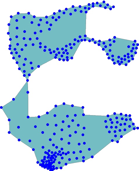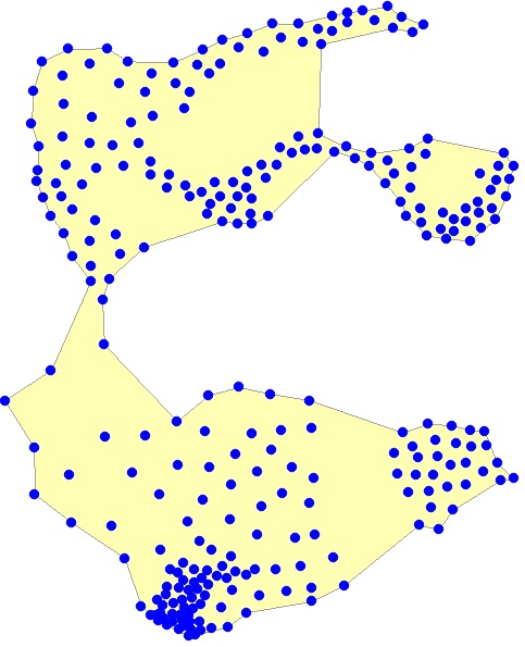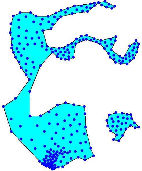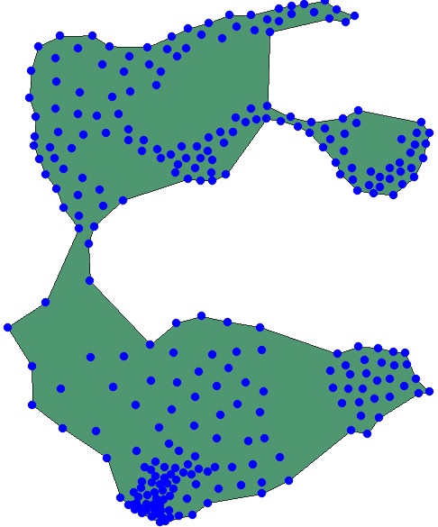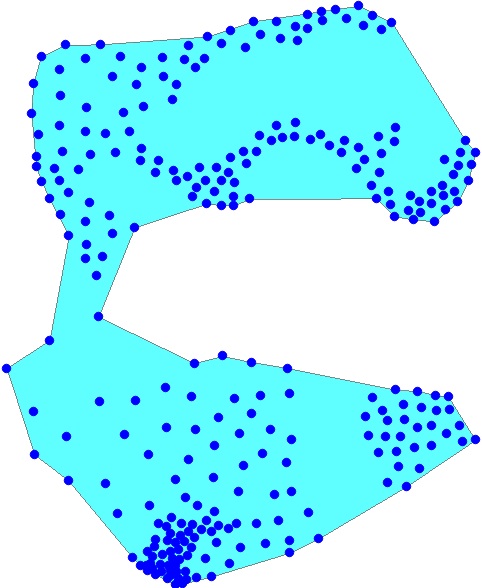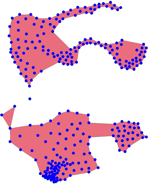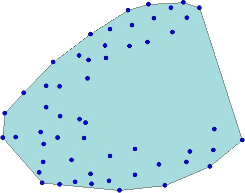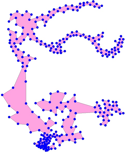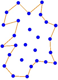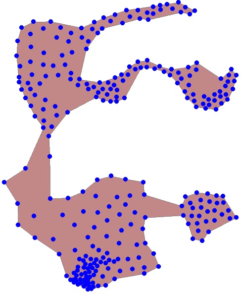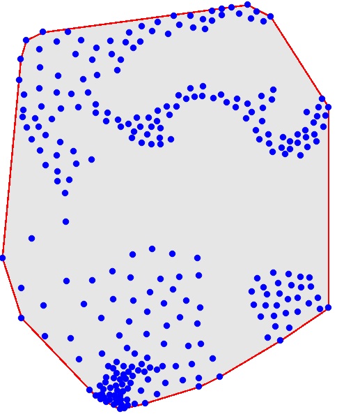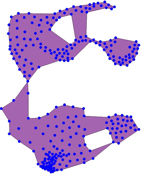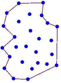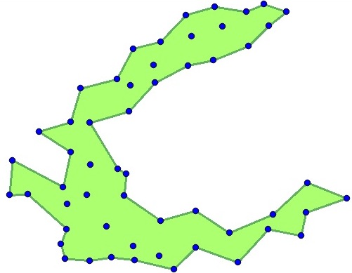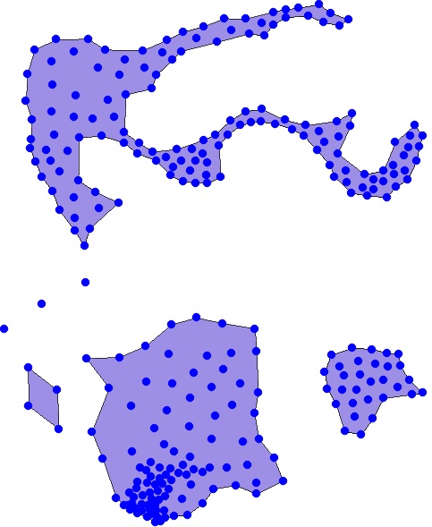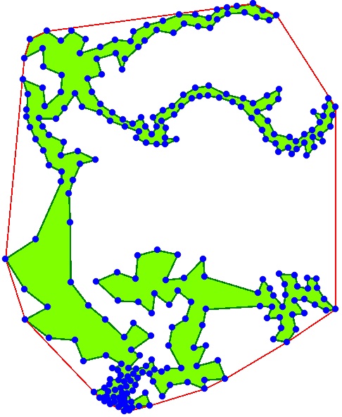 Je vais présenter ici les principes de création de ces enveloppes concaves (2D) et un inventaire des moyens de les créer avec Python, R, QGIS, GRASS GIS, OpenJUMP, PostGIS, SpatiaLite et enfin JavaScript. Mais, quelques éléments théoriques sont cependant nécessaires pour éviter quelques déconvenues... (je n'ai rien trouvé pour gvSIG, mais comme les versions pour Mac OS X sont aux abonnés absents, la dernière version disponible étant la 1.12, peut-être que...)