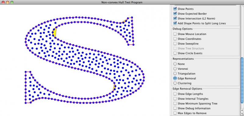 - exploitant le modèle des characteristic shapes (pdf) qui permet de générer de manières ordonnée à l'aide d'un seul paramètre normalisé toute la famille des formes alpha depuis l'enveloppe convexe jusqu'à la surface minimale (utlilisé avec une extension d'OpenJUMP, voir plus bas)