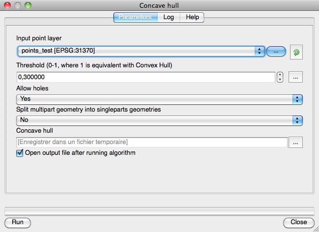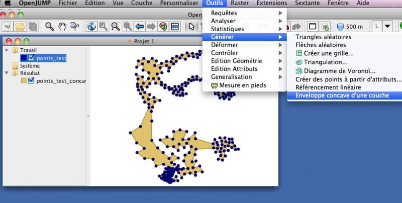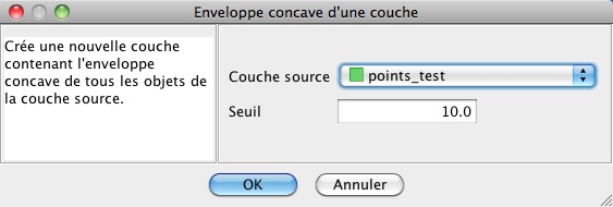 - Comme toujours, le méconnu OpenJUMP offre aussi une extension très performante qui permet de créer des enveloppes concaves: Concave hull based on JTS. Elle est basée sur l'algorithme « characteristic shape » proposé par M.Duckham, L.Kulik, M.Worboys & A.Galton en 2008 dans Efficient generation of simple polygons for characterizing the shape of a set of points in the plane (pdf). La forme alpha produite par la commande est contrôlée par la variable seuil (le paramètre normalisé):