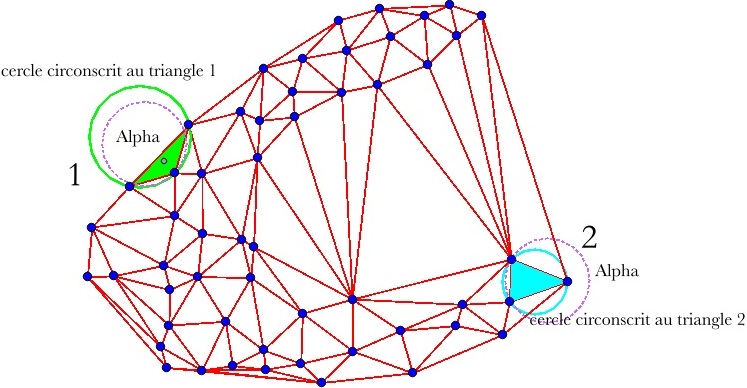 3) le complexe alpha est ensuite calculé en ôtant tous les triangles qui ont un cercle circonscrit dont le rayon est supérieur au cercle de rayon α (comme le triangle 1 sur la figure, alors que le triangle 2 sera conservé);