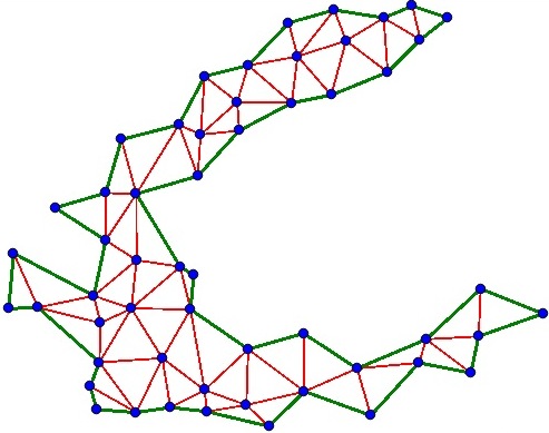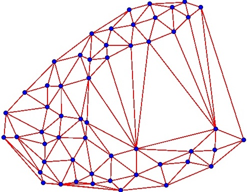 Tout ça vous parait un peu obscur, non ? Comme rien ne vaut la pratique pour éclaircir les choses, examinons comment les calculer avec la triangulation de Delaunay (2D ici). Le principe est donc d'éliminer tous les noeuds de la triangulation de Delaunay qui appartiennent à un triangle dont le rayon de la sphère circonscrite dépasse la valeur α choisie.