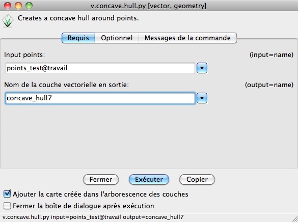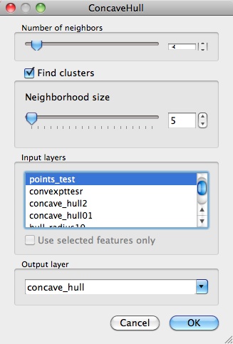- avec le plugin encore expérimental de Detlev Neumann (il faut le télécharger et l'installer soi-même) en Python, QGIS-ConcaveHull-Plugin. Il n'utilise pas la triangulation de Delaunay proprement dite, mais l'algorithme des K plus proches voisins suivant la méthode proposée par A. Moreira and M.B. Santos dans Concave hull : a k-nearest neighbours approach for the computation of the region occupied by a set of points (pdf) en 2007. Il permet en plus de séparer les résultats en groupes (clusters);