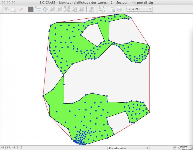 Ici, plus besoin de se préoccuper de la recherche de la valeur α, tout est fait automatiquement par le programme. Un exemple d'application est donné dans mon script concave_hull2.py ou un rayon de recherche peut être spécifié.