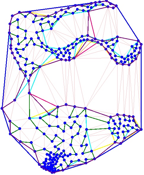 - utilisant le modèle des formes alpha pondérées, la théorie des Graphes, celui d'enveloppe de superficie minimale (MAE : computation of Minimal Area Enclosure) celui de fractionnement et fusion ou segmentation (split and merge procedure), celui de Locally-Density-Adaptive-α-hull ou celui de diagramme de Voronoï contraint, non abordés ici;
