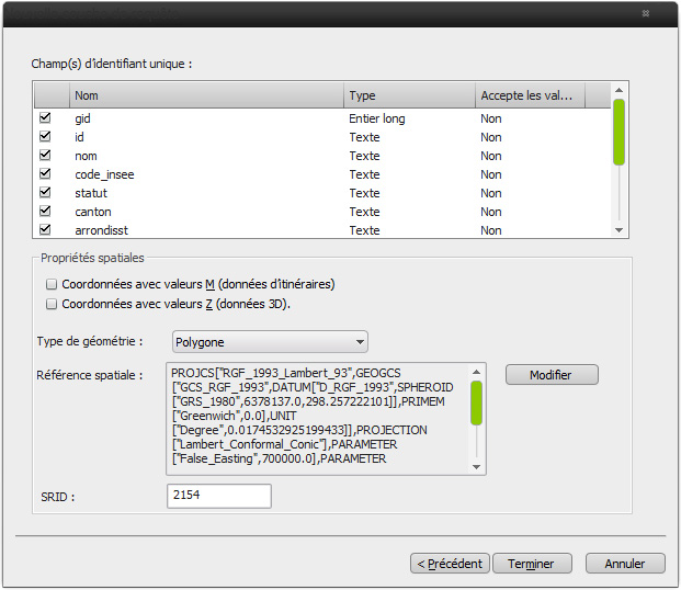 Bien penser à indiquer un nom, cliquez sur Valider et aller sur Afficher les paramètres avancés. Cette manipulation est optionnelle mais parfois ArcGIS ne reconnait pas la clé primaire (cf capture) et coche tout et cela abouti bien souvent à un plantage du logiciel ou à une couche vide.