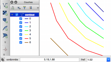5) résultat dans QGIS après exportation des lignes résultantes sous forme de shapefile: