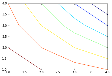import matplotlib.pyplot as pltx = [1,2,3,4]y = [1,2,3,4]m = [[15,14,13,12],[14,12,10,8],[13,10,7,4],[12,8,4,0]]cs = plt.contour(x,y,m)plt.show()