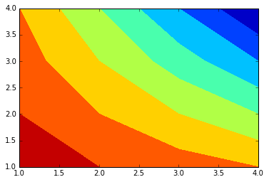 import matplotlib.pyplot as pltx = [1,2,3,4]y = [1,2,3,4]m = [[15,14,13,12],[14,12,10,8],[13,10,7,4],[12,8,4,0]]cs = plt.contourf(x,y,m)plt.show()